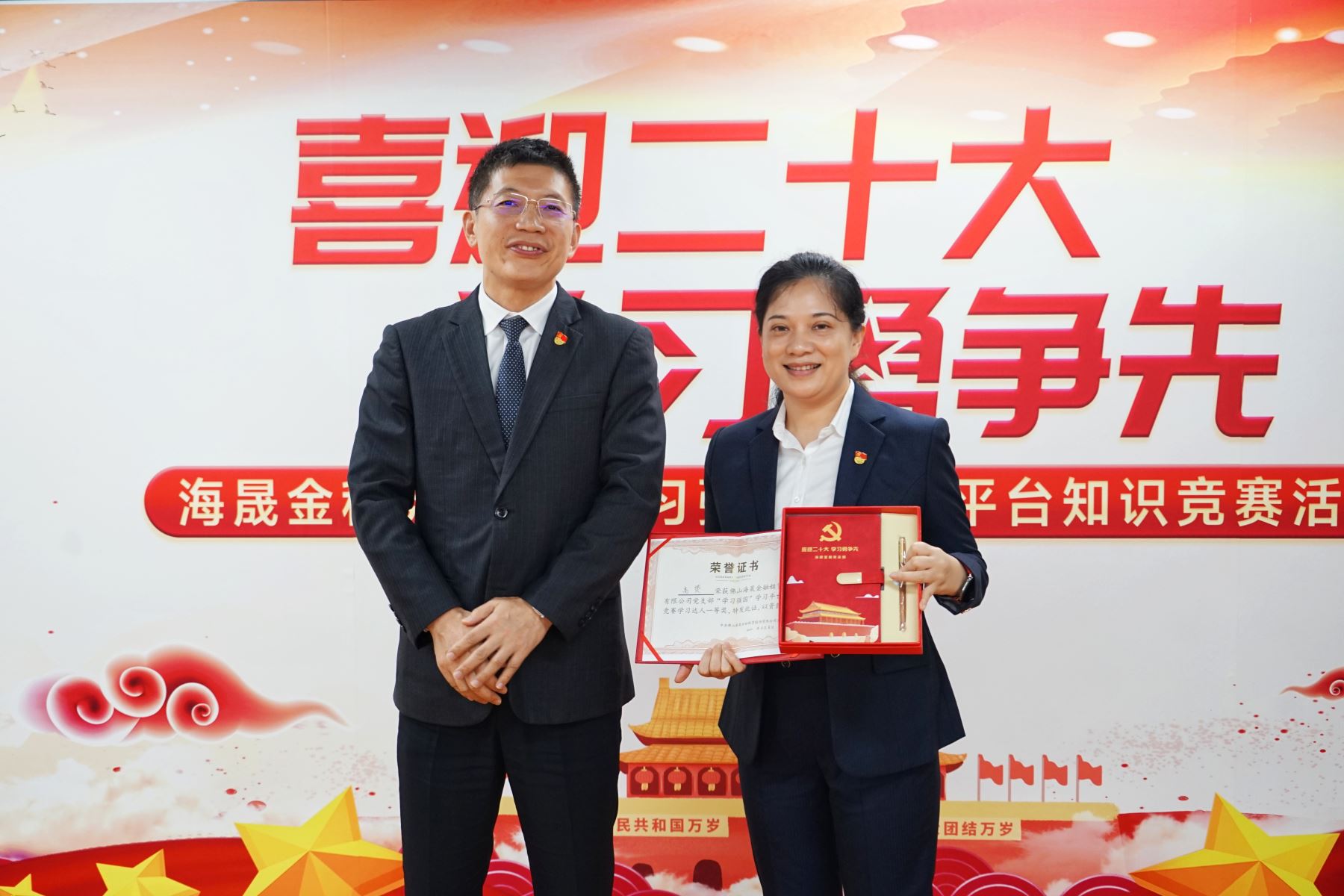 2022年6月8日,为深入学习贯彻习近平新时代中国特色社会主义思想,大力营造迎接宣传党的二十大胜利召开的浓厚氛围,海晟金租党支部借助2022年佛山市“学习强国”学习平台知识竞赛暨全民争当“学习达人”活动契机,广泛发动广大党员干部群众,以赛促学,开展主题为“喜迎二十大、学习勇争先”的“学习强国”学习平台知识竞赛。