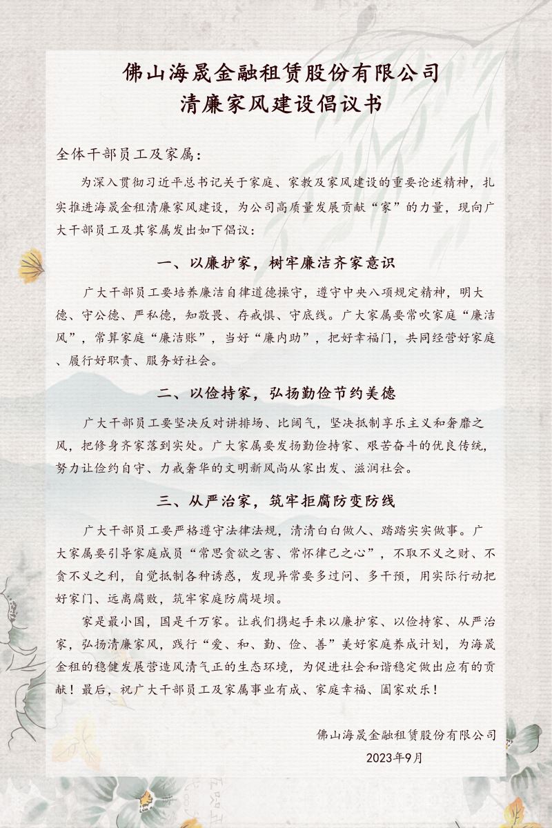 佛山海晨金融租赁股份有限公司清廉家风建设倡议书