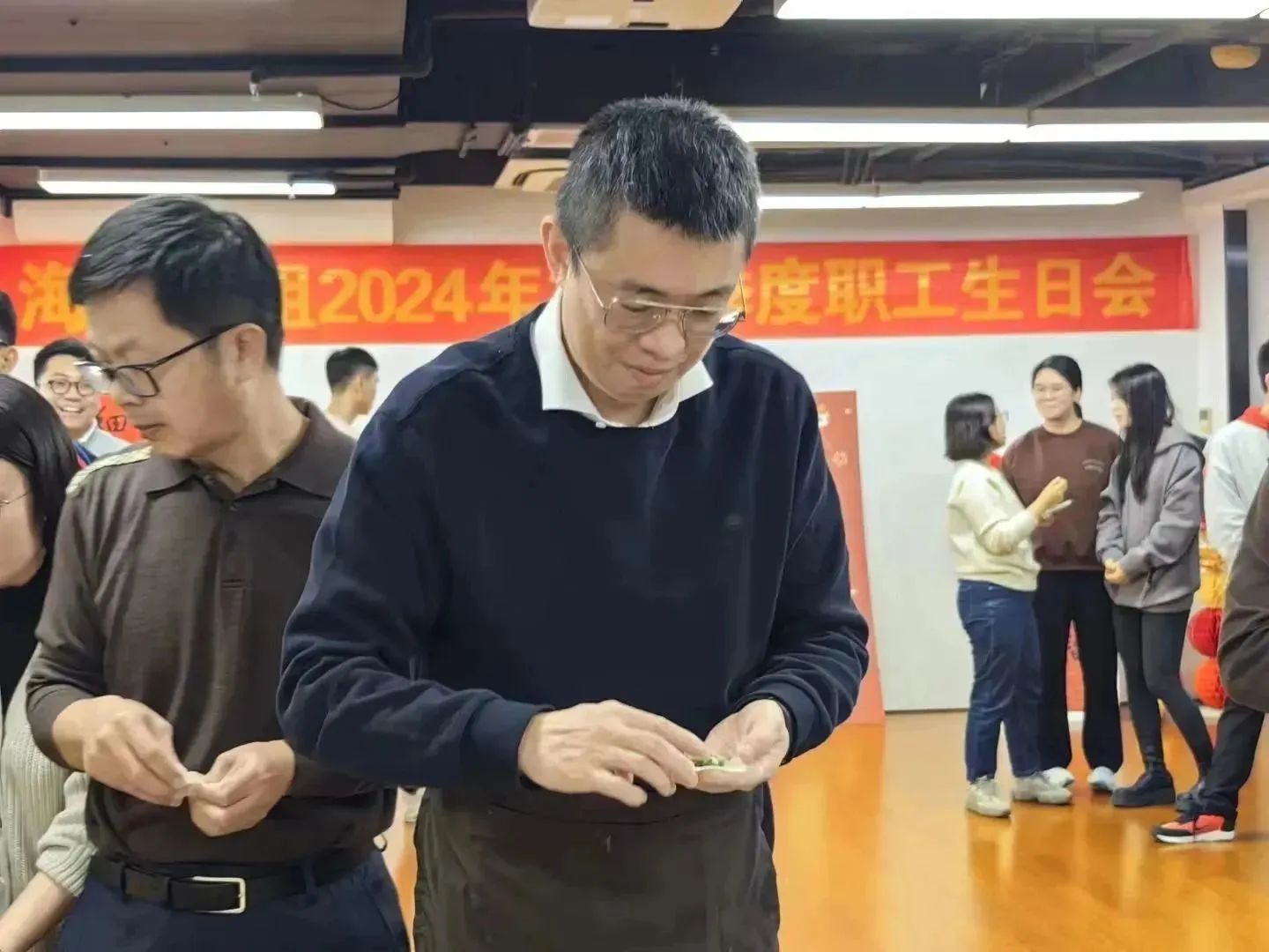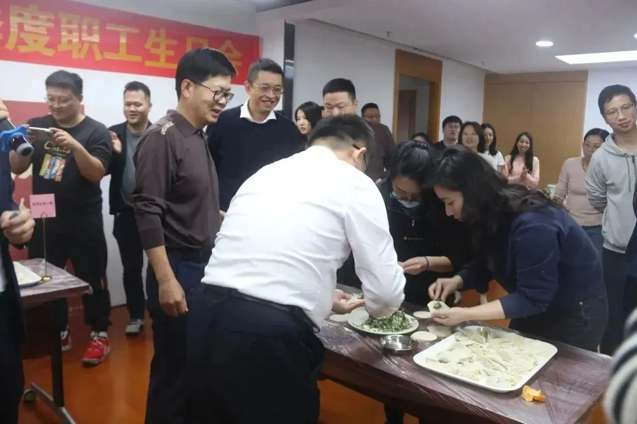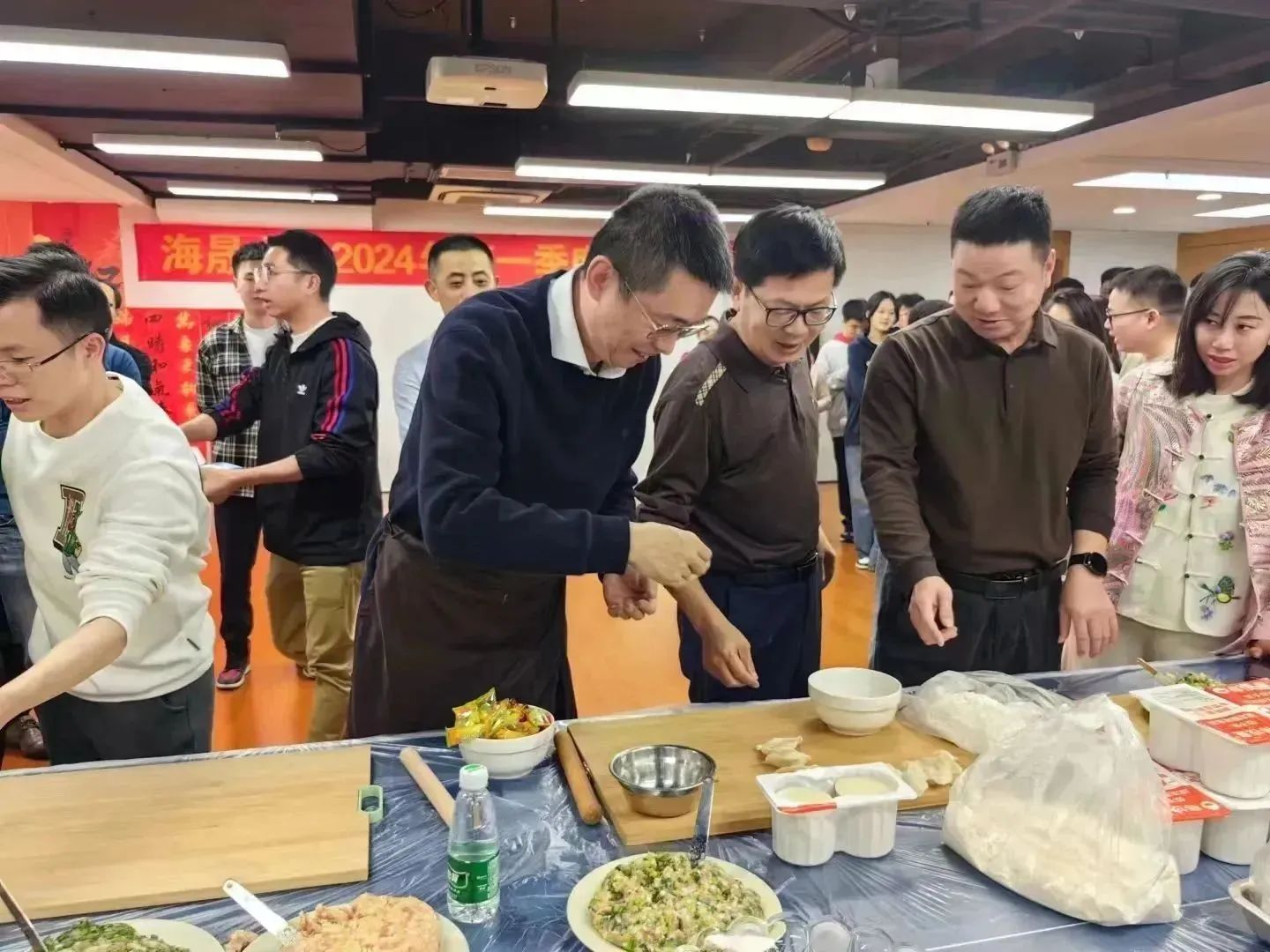公司班子领导与一季度寿星们一同分享了切蛋糕的喜悦时刻,随后,肖光董事长与公司班子领导一起向职工们示范包饺子。肖光董事长一边挽起衣袖包饺子,一边与海晟职工们展开亲切的交流与分享,“如果吃到有硬币的饺子代表恭喜发财,吃到苹果馅儿的饺子代表平平安安,吃到糖果馅儿的饺子代表生活甜蜜”生动的讲解,让不少职工对北方年俗的美好寓意有了更深了解,包饺子也成了许下新年愿望的美好经历。