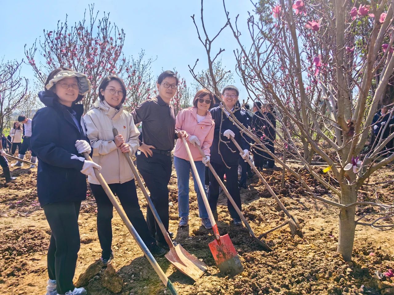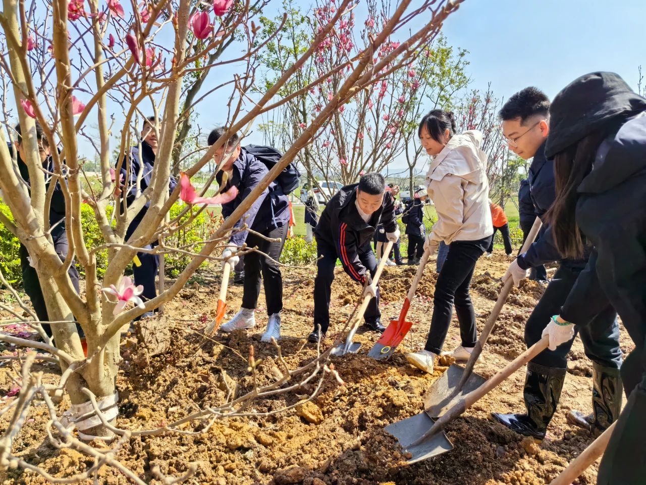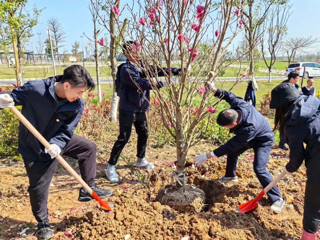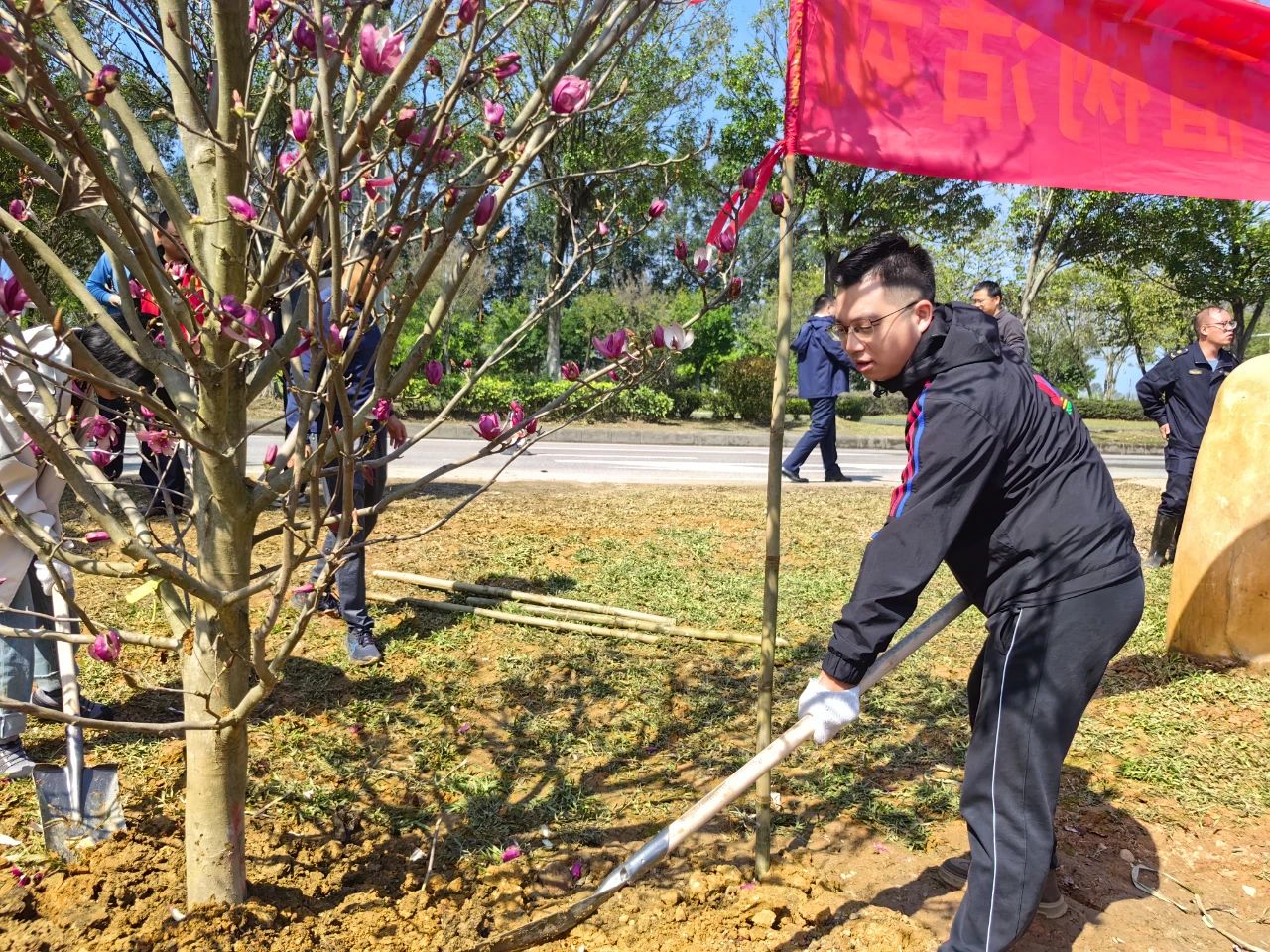 在简单的揭幕仪式后,活动正式进入植树环节。在明媚的春光下,海晟金租职工与乐平镇政府的党员同志们带头植树,众人三五成群,干得热火朝天。大家默契配合,挥锹铲土、扶正树苗、培土填坑,细心栽种了30棵黄花风铃木和玉堂春树苗。