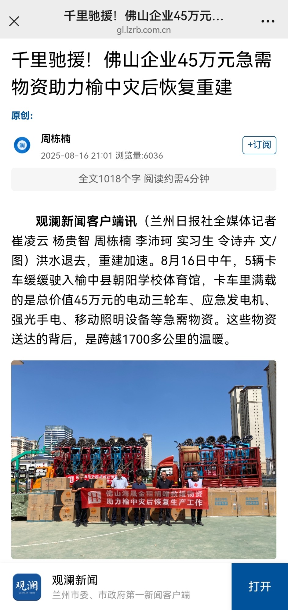 8月7日以来,兰州市榆中县等地因极为罕见的连续强降雨引发山洪灾害,造成重大人员伤亡和财产损失。佛山海晟金租从新闻报道中了解到榆中的灾情,彼时,公司业务总监李永杰联系了位于兰州的客户,向客户表达关心,也积极了解相关情况。“我们虽然是广东佛山的金融机构,但我们服务了很多兰州的客户,听到兰州榆中县发生灾情了,感觉很揪心,应尽绵薄之力,帮助榆中人民尽快重建家园。”