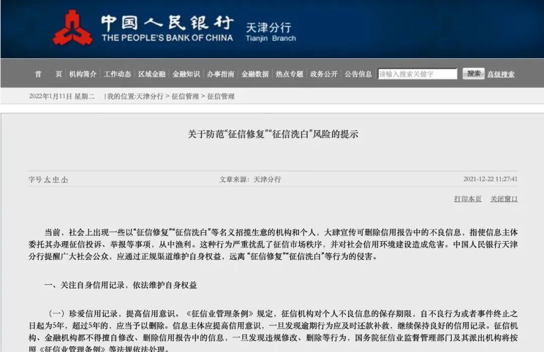 去年12月22日,中国人民银行天津分行发布“关于防范‘征信修复’ ‘征信洗白’风险的提示”。其中提到,征信领域不存在“征信修复”“征信洗白”等说法。 “征信修复”实则“借机牟利” ,这种行为严重扰乱了征信市场秩序,并对社会信用环境建设造成危害。