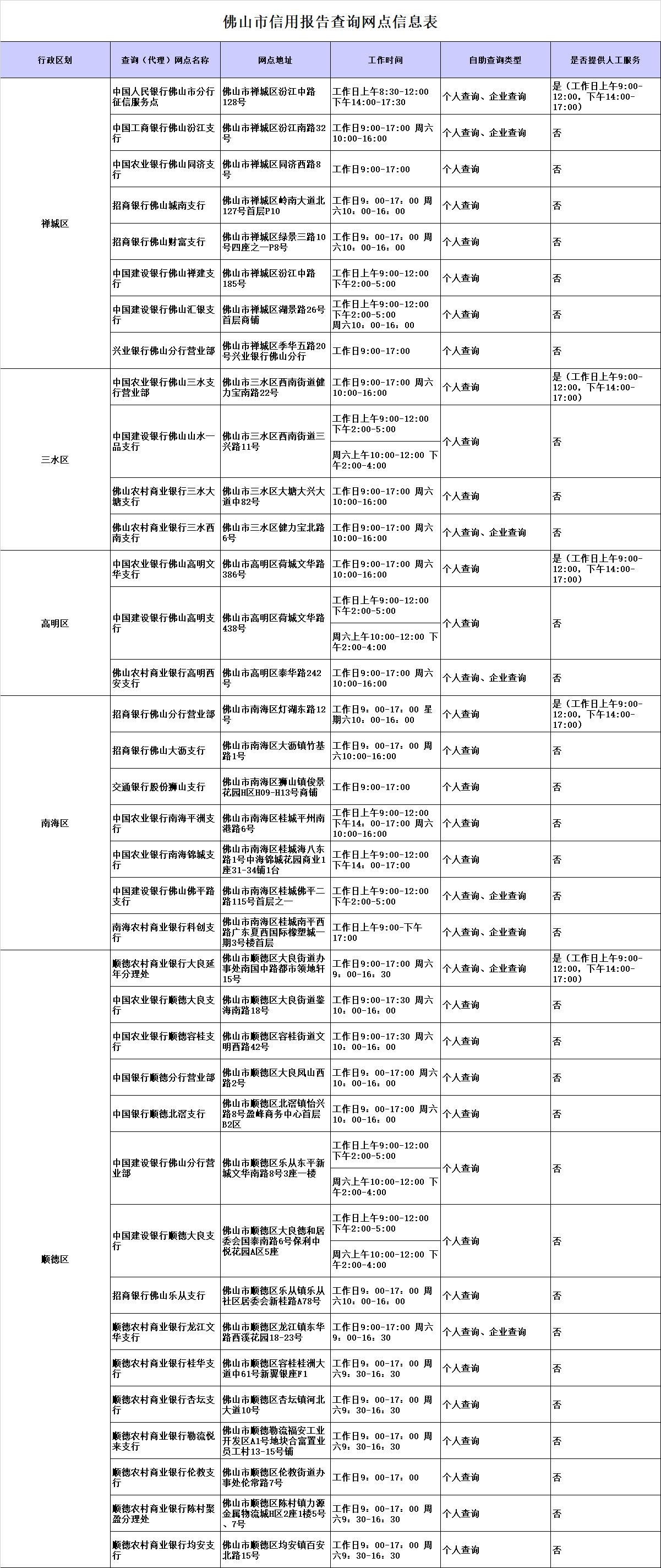 中国人民银行佛山市分行秉承“征信为民”服务理念,在全市布设了37个信用报告查询点(含代理点,代理点提供的信用报告与人民银行查询点提供的完全相同),实现佛山市五区全覆盖。其中,37个可提供个人信用报告自助查询,8个可提供企业信用报告自助查询,5个可提供人工查询服务(可查询个人、企业信用报告)。个人和企业均可进入“广东征信预约”微信小程序,查找就近的查询网点进行预约,方便快捷查询信用报告。佛山市查询点分布情况具体如下: