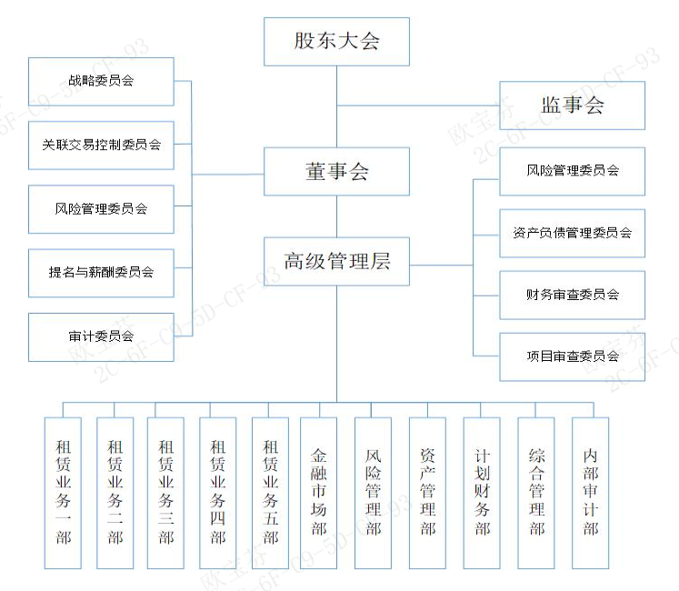 公司坚持以“保证持续发展、保证审慎合规经营、保证在可承受范围内实现风险与收益合理匹配”为原则,建立了分工合理、职责明晰的风险管理组织体系,由董事会、监事会、高级管理层、风险管理部及其他部门组成。董事会对公司的风险管理承担最终责任;董事会下设风险管理委员会,授权其履行部分风险管理职责;监事会负责监督风险管理体系的建立和运行;高级管理层负责风险管理政策的具体实施和执行。公司搭建了风险管理三道防线,租赁业务部门及金融市场部门为第一道防线;风险管理部门、资产管理部门为第二道防线的主要部门;内审部门为第三道防线。