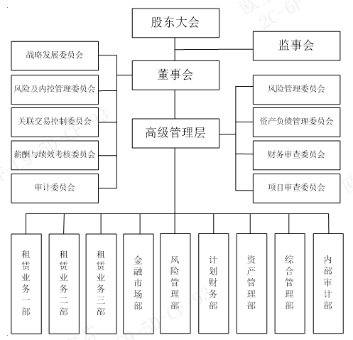 公司坚持以“保证持续发展、保证审慎合规经营、保证在可承受范围内实现风险与收益合理匹配”为原则,建立了分工合理、职责明晰的风险管理组织体系,由董事会、监事会、高级管理层、风险管理部及其他部门组成。董事会对公司的风险管理承担最终责任;董事会下设风险管理委员会,授权其履行部分风险管理职责;监事会负责监督风险管理体系的建立和运行;高级管理层负责风险管理政策的具体实施和执行。公司搭建了风险管理三道防线,租赁业务部门及金融市场部门为第一道防线;风险管理部门、资产管理部门为第二道防线的主要部门;内审部门为第三道防线。